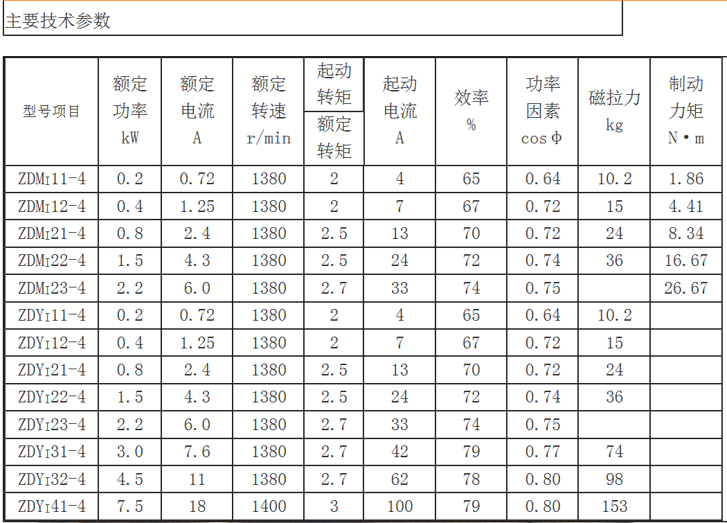 ZDY系列電動機采用380V電源,50Hz,基本工作制為S4,負載持續率25%,每小時起動次數不低于90次/h。